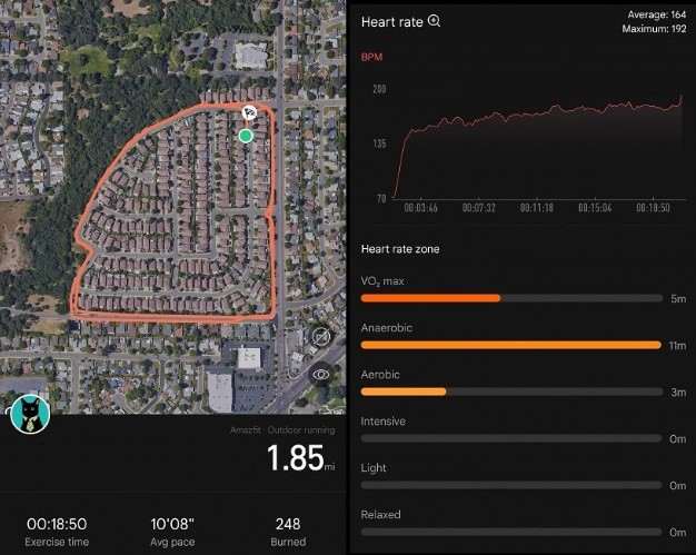 Сердцем часов, конечно же, является приложение «Тренировки», ради которого T-Rex будут брать любители активного образа жизни. При включенном отслеживании часы выводят на экран информацию, которая относится к конкретному режиму тренировки. Это может быть прошедшее с начала занятия время, преодоленное расстояние, скорость движения, пульс или GPS-трек. По завершению тренировка сохраняется в журнал операций в приложении Amazfit, где можно смотреть различную статистику и графики.