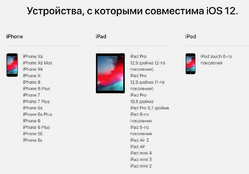 В первую очередь убедитесь, что ваш гаджет входит в список устройств получивших свежую версию операционной системы. Перечень моделей не изменился со времен выхода iOS 11, это все Айфоны вышедшие после 5S, iPad Mini 2 и новее, а также iPod Touch 6 поколения. В сумме апдейт получили 26 устройств, среди которых: