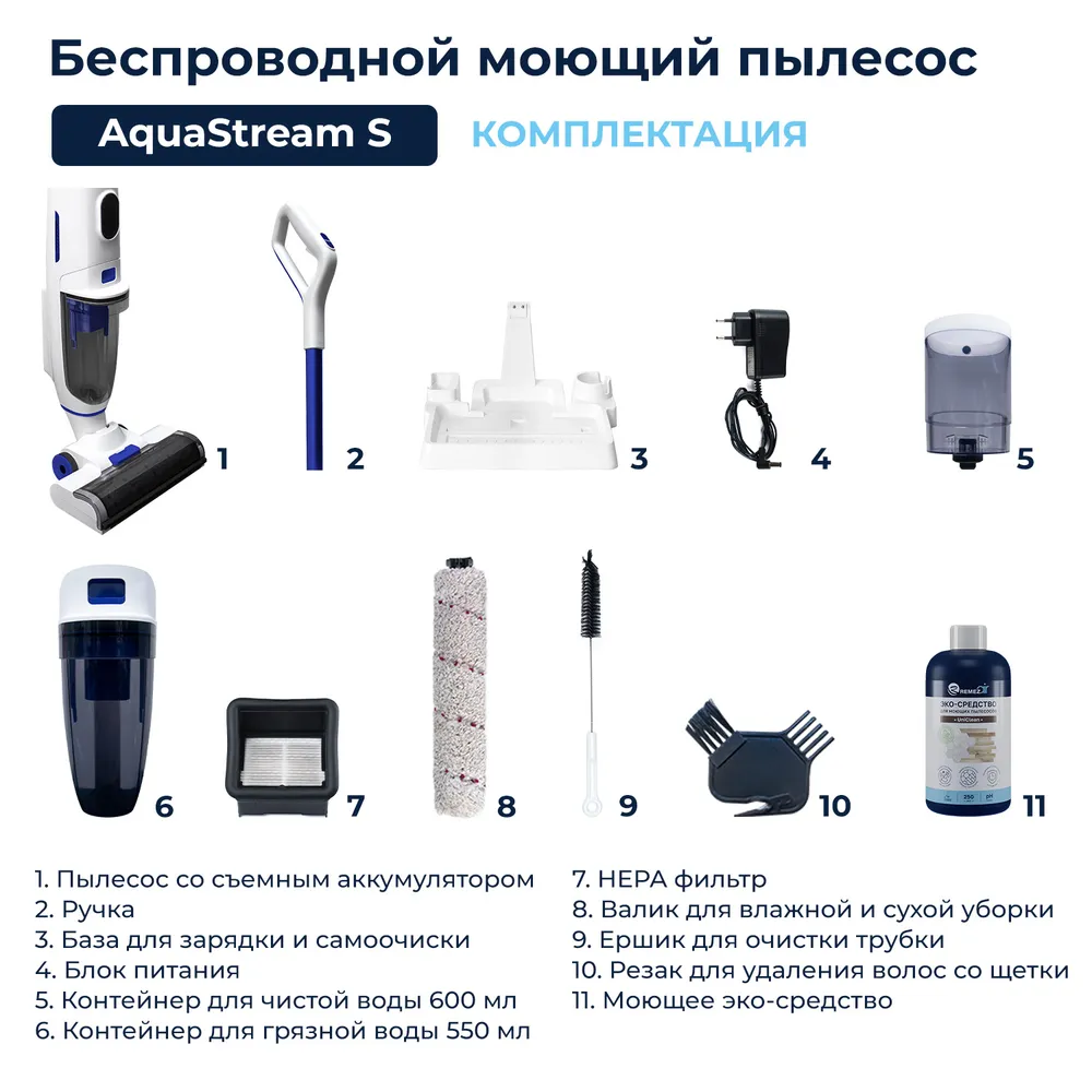 Уборка в доме — нужное, но скучное занятие, на которое хочется тратить как можно меньше времени, причем желательно не в ущерб качеству. Управиться быстрее поможет беспроводной пылесос REMEZair AquaStream S – продвинутая модель, рассчитанная на сухую и влажную уборку. Она всасывает мусор и моет пол одновременно, и подходит для любых напольных покрытий, хоть ламината, хоть ковролина.