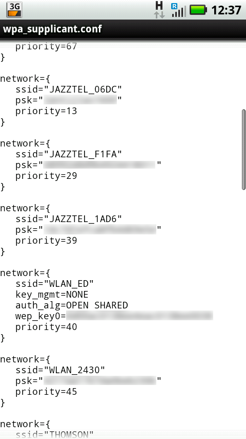 Wpa_supplicant.conf — это системный файл конфигурации, где, кроме всего прочего, вы можете найти информацию о Wi-Fi подключениях в незашифрованном виде. Открыв файл, вы должны обратить внимание на столбцы, подписанные словом network (от англ. Сеть). Как можно догадаться, там хранится информация о WI-Fi сетях, в том числе их ssid (названия) и psk (пароли).