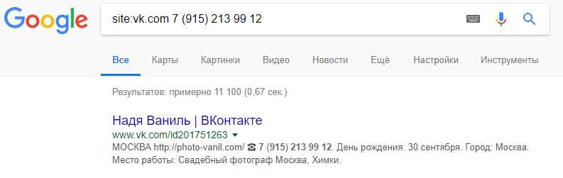 Куда лучше работает способ поиска через поисковые системы: Yandex, Google и другие. У каждой из этих систем имеется встроенная возможность индексации поисковых запросов исключительно в рамках одного сайта. Для этого нужно ввести «site:vk.com Номер телефона» . Если поиск не дал результатов, то либо номер никогда не был указан в пределах сети ВКонтакте, либо находится в скрытых для индексации профилях и в приватных сообществах, что бывает не так уж и часто в случае с личными номерами. Наверняка у вас получится найти какие-либо сообщества, где упоминался этот номер. Это может быть группа определённого города или района, к примеру. Более детально о поиске страницы по номеру Вконтате вы можете прочесть в соответствующей статье.
