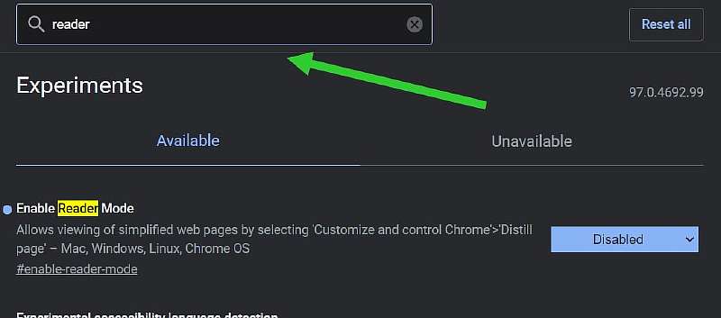 - В появившемся окне введите в поиск reader mode;