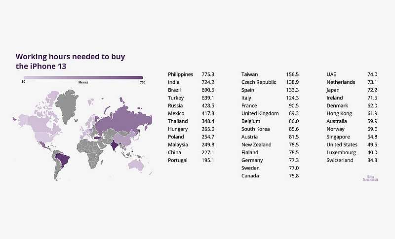 Экономисты любят составлять разнообразные индексы для сравнения благосостояния населения в разных странах: многие наверняка слышали об индексе биг-мака, а с появлением iPhone в моду вошло сравнение количества времени, которое нужно потратить, чтобы заработать на популярный девайс. Аналитическая компания Money SuperMarket обнародовала такое исследование относительно свежего iPhone 13 в базовой комплектации на 128 ГБ памяти.