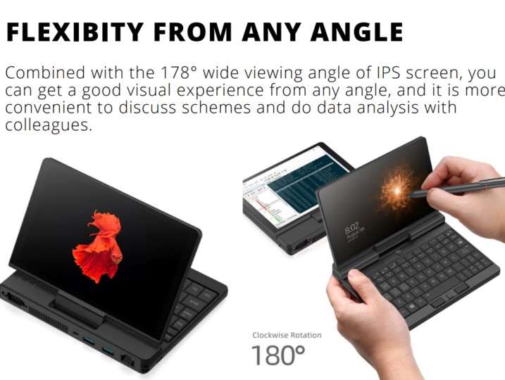 На этом особенности ноутбука не заканчиваются. Он оснащен крохотным по современным меркам 7-дюймовым IPS дисплеем с FHD разрешением, который можно вращать на 180 градусов, что позволяет превратить устройство в подобие планшета.