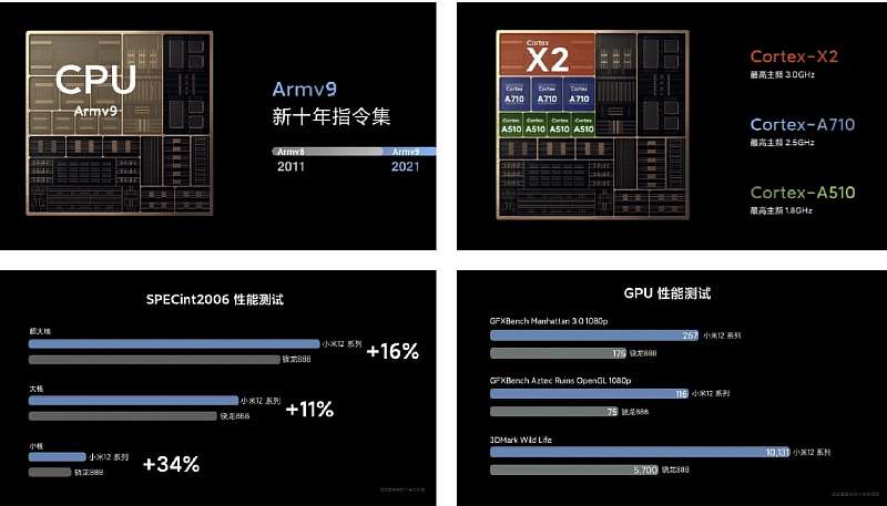 Тесты, проведенные Xiaomi Lab, показывают, что пиковая производительность ядра Cortex-X2 увеличилась на 16% по сравнению с Cortex-X1 в Snapdragon 888. В свою очередь, производительность ядер Cortex-A710 увеличилась на 11% по сравнению с Cortex-A78 и ядер Cortex-A510 на целых 34% по сравнению с Cortex-A55. Во всех случаях также отмечается более высокая энергоэффективность, то есть лучшее соотношение энергозатрат к КПД.