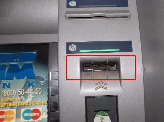 Всегда нужно внимательно осматривать банкомат, а именно область картоприемника и клавиатуру, на предмет наличия инородных предметов. Самый распространенный в России скиммер выглядит так: