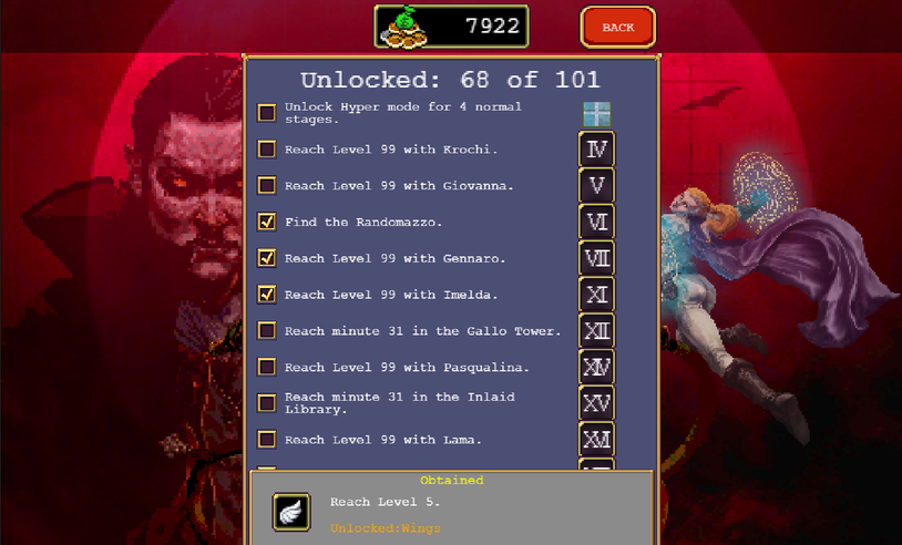 Обращайте внимание на вкладку с достижениями. Тут можно посмотреть, какие условия нужно выполнить для разблокировки контента. Открытие новых локаций, персонажей и предметов значительно повышает интерес к «вампирам». Поэтому старайтесь начинать каждый забег с какой-то конкретной целью и прогрессировать.