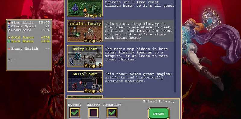 Vampire Survivors – рогалик, выполненный в ретро-стиле. У нее пиксельная графика, вид сверху и множество отсылок к 8-битным консолям. Что касается геймплея, персонаж автоматически атакует ближайших врагов, а игроку остаётся только перемещаться по карте, стараясь не попасть в окружение. Конечная цель – продержаться в бесконечных волнах монстров на протяжении 30 минут.
