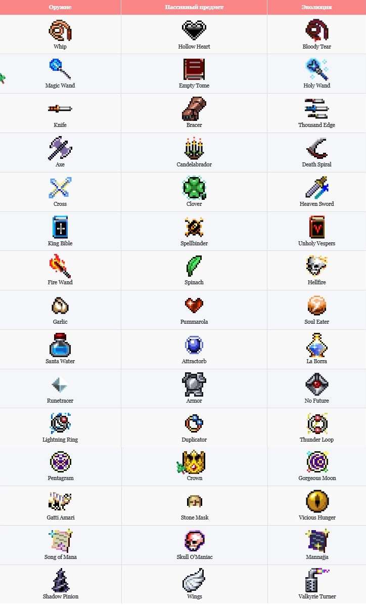 Таблица эволюции предметов в Vampire Survivors