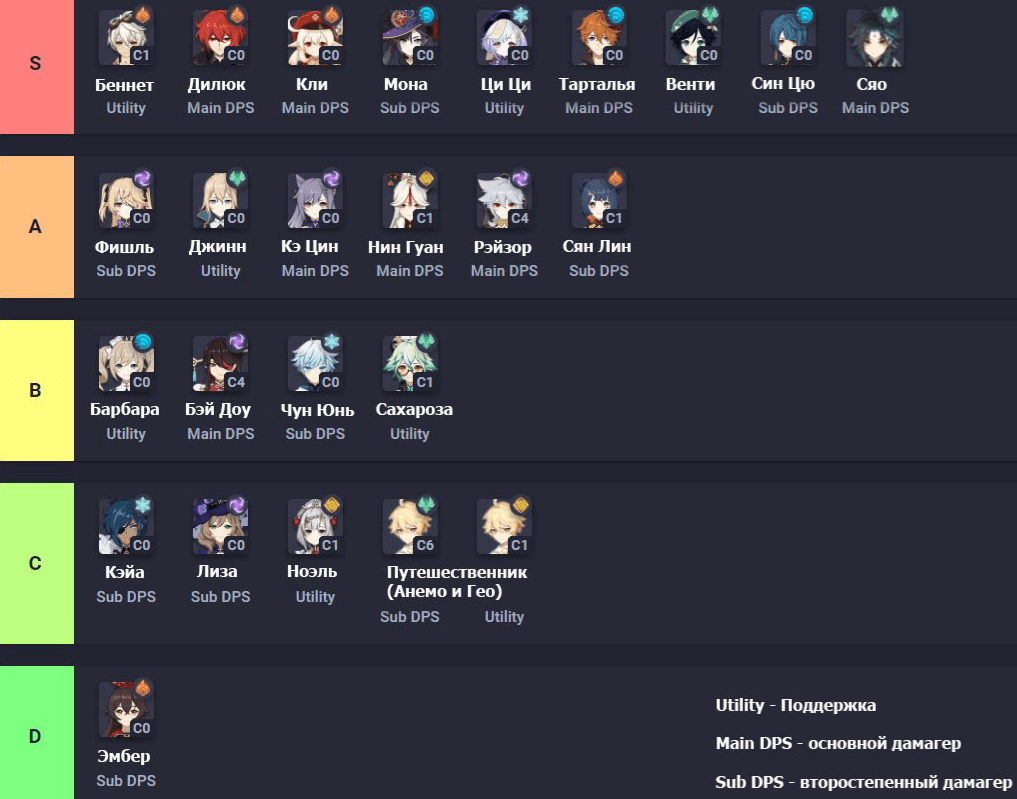 Герои тира S считаются самыми сильными, D — самыми слабыми. Подпись под иконкой обазначает их предназначение — утилити (саппорт, лечение), мейн дпс (наносит основной урон), саб дпс (второстепенный дамагер, который путем своих способностей повышает урон основных героев).