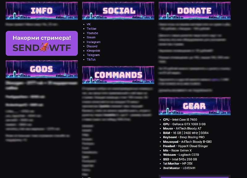 Вот пример оформление Твич канала, которое можно сделать своими руками абсолютно бесплатно. Это хороший вариант для начинающих стримеров, содержащий всю важную информацию для зрителей.