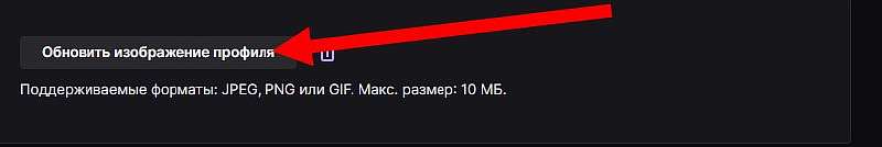 В открывшемся меню кликаем «Обновить изображение профиля». Обращаем внимание на сноску «Поддерживаемые форматы: JPEG, PNG или GIF. Макс. размер: 10 МБ.» Если изображение под эти требования не подходит, подкорректируйте его.