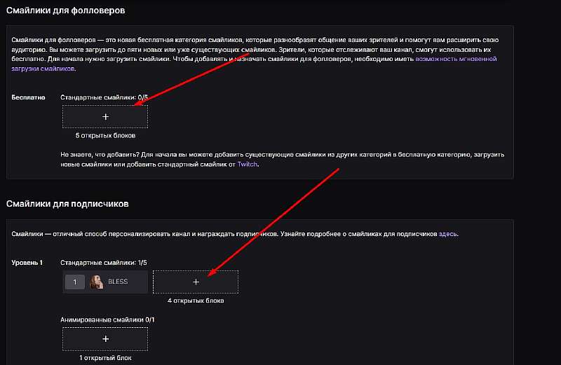 Затем выбираем, какой смайлик будем загружать – для фолловеров или подписчиков и жмём на плюсик в нужной категории.