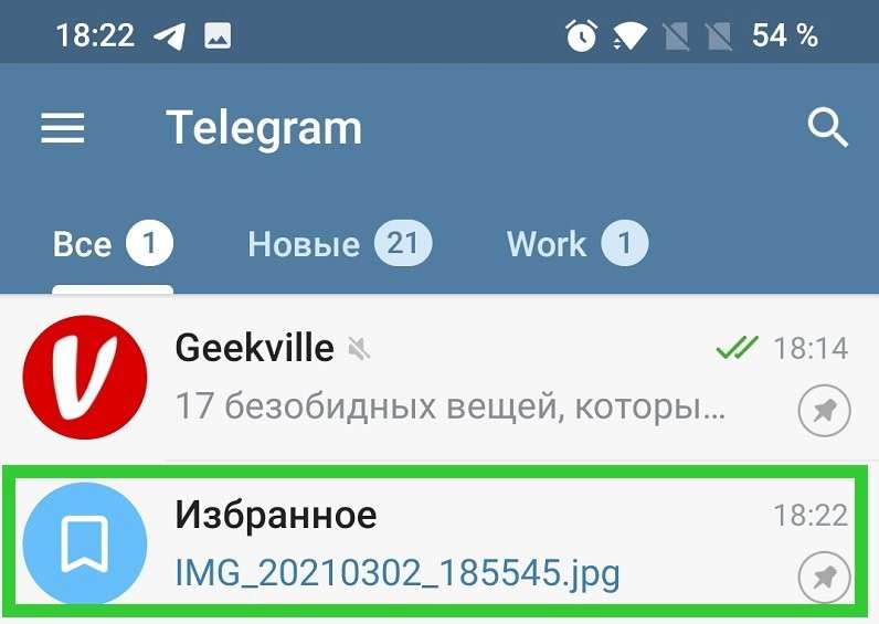 Для этого существует вкладка «Избранное». Сделайте по ней долгий тап и в контекстном меню выберите «Закрепить», чтобы диалог с собой всегда отображался в верхней части экрана.