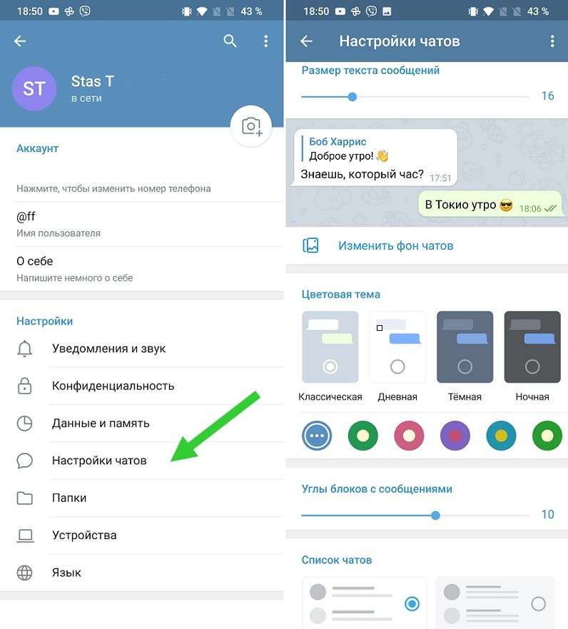 Внешний вид чатов можно менять, выбрав «Настройки» > «Настройки чата» > «Цветовые темы»