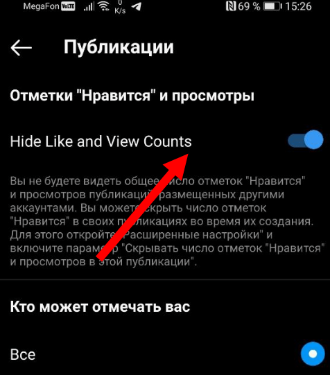 - Показ лайков отключается установкой тумблера «Hide Like and View Counts» из первой строчки в активное состояние.