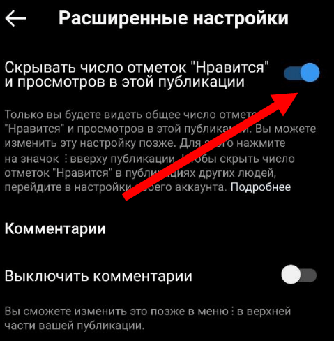 - Активируйте тумблер «Скрыть лайки и количество просмотров в этой публикации», после чего вернитесь к посту и нажмите «Опубликовать».