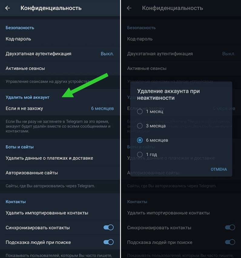 Для начала про функцию, о которой мало кто знает. Она по умолчанию включена для всех пользователей Telegram. Если не пользоваться мессенджером в течение определенного времени, ваша учетная запись автоматически удалится. На выбор есть несколько вариантов: 1 месяц, 3 месяца, 6 месяцев и год. По умолчанию стоит 6 месяцев, а поменять промежуток можно следующим образом: