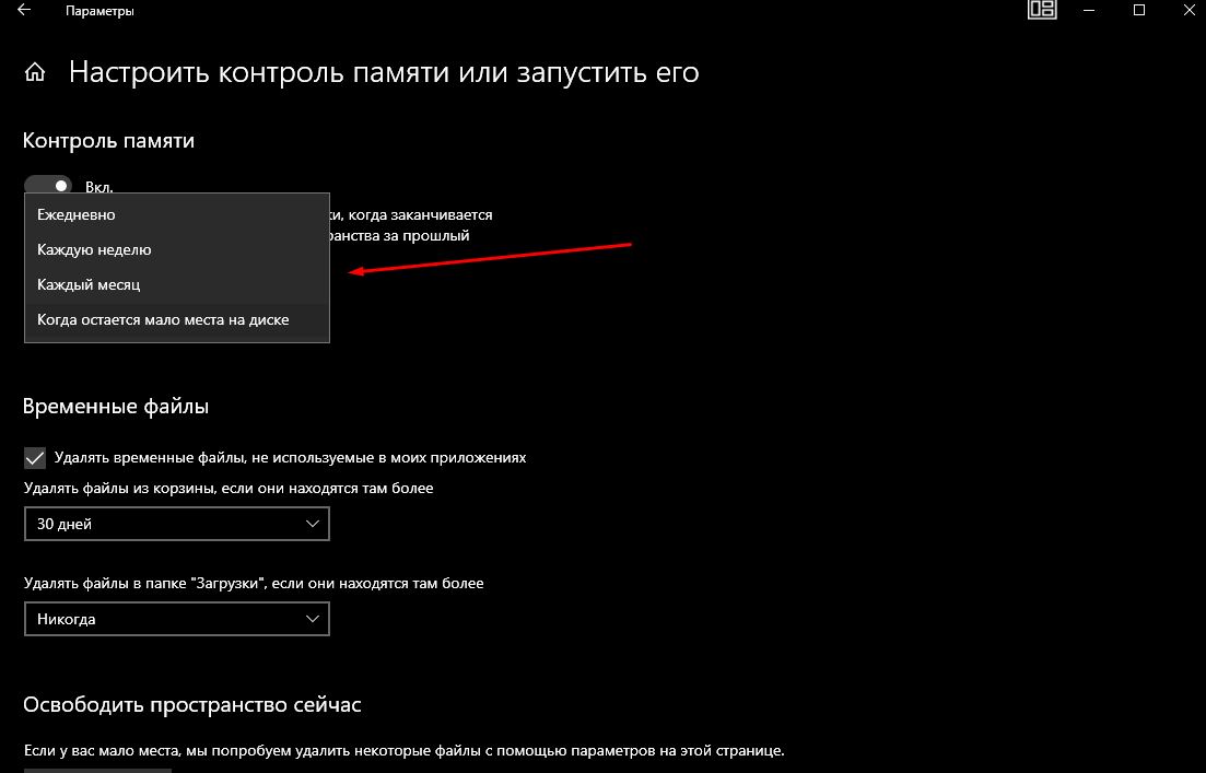 Переключите тумблер во включенное состояние, а затем нажмите «Настроить контроль памяти или запустить его» и выберите время, через которое временные файлы будут удаляться автоматически.
