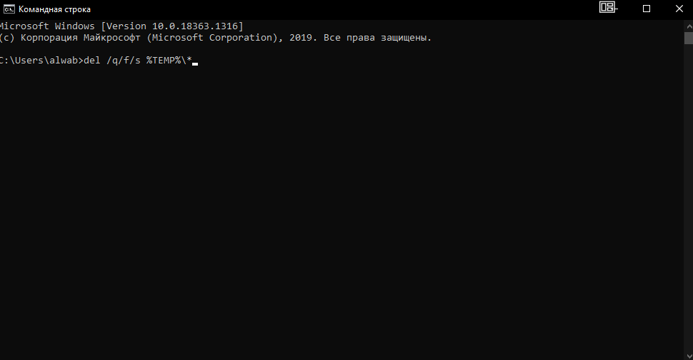 - В появившуюся консоль вставьте del /q/f/s %TEMP%\* и нажмите Enter. Это сотрет все временные файлы с вашего компьютера.