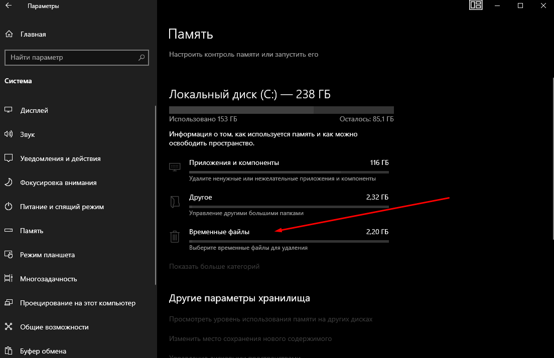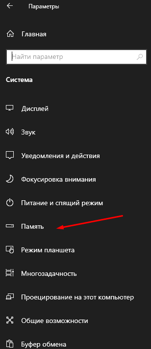 P.S. В Windows 10 есть встроенная утилита, включив которую, компьютер будет автоматически в заданное время проводить проверку временных файлов и удалять их с диска С:/. Находится она тут же, в разделе «Память», в основном окне на самом верху.
