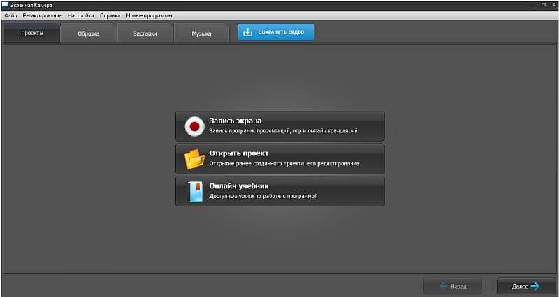 Среди простых программ для новичков можно выделить Экранную Камеру. Она предлагает 3 варианта записи: захват всего экрана, его области или конкретного окна. Программа работает даже на слабых компьютерах с устаревшими операционками, позволяет записывать скринкасты любой продолжительности. В ней можно сразу записать видео со звуком с микрофона или добавить его на готовый ролик.