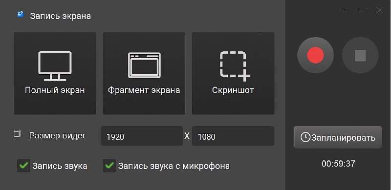 - Откройте программу и кликните «Запись экрана». Настройте параметры захвата — выделите полный экран или его часть, укажите, откуда брать звук. Затем кликните значок записи.