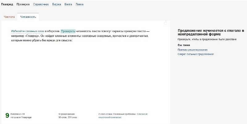 Избегайте сложных слов и оборотов. Проверить читаемость текста помогут сервисы проверки текста, например «Главред». Он найдет сложные элементы: составные сказуемые, причастия и деепричастия, которые можно убрать без вреда для смысла.