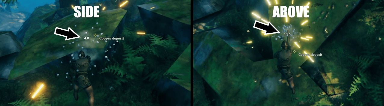 Бейте киркой правильно. Фишка в том, что при ударе сверху по месторождению она наносит в два раза больше урона, чем при боковом ударе. Как только вы найдете жилу меди – запрыгните на нее сверху и только потом начинайте махать инструментом.