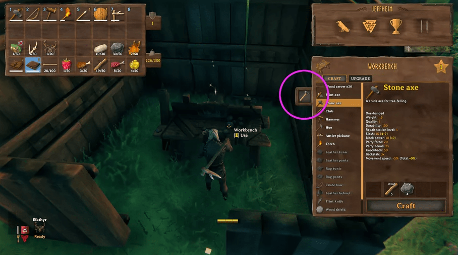 Первым делом добудьте древесину и камень. Это базовые материалы, с помощью которых вы сможете скрафтить основные инструменты: молоток для создания построек, топор для рубки деревьев и более быстрой добычи древесины, дубину и щит, чтобы отбиваться от врагов.