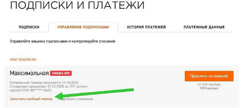 - Под названием подключенной подписки отобразится кнопка «Закончить пробный период» или «Отключить подписку», она нам и нужна.