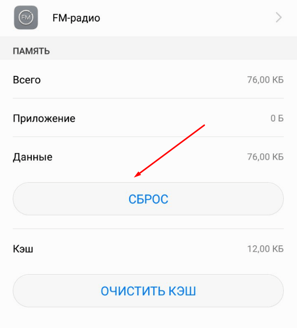 - Здесь нужно найти приложение «Радио». Нажав на него, выбираем раздел «Память», а далее действие «Сброс».