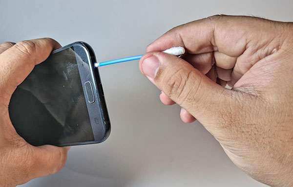 - Аккуратными круговыми движениями внутри разъема постарайтесь выцепить грязь.