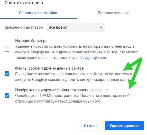 - В поисковую строку браузер вставьте chrome://settings/clearBrowserData и нажмите Enter. В открывшемся меню поставьте галочки около двух нижних пунктов, измените временной диапазон на «Все время» и нажмите «Удалить данные».