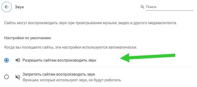 Если видео воспроизводятся без звука, проверьте его настройки в меню chrome://settings/content/sound. Активен должен быть пункт «Разрешить сайтам воспроизводить звук», как на картинке ниже.