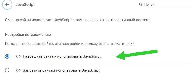 Вставьте в поисковую строку chrome://settings/content/javascript. Убедитесь, что пункт «разрешить Javascript» стоит в активном положении.