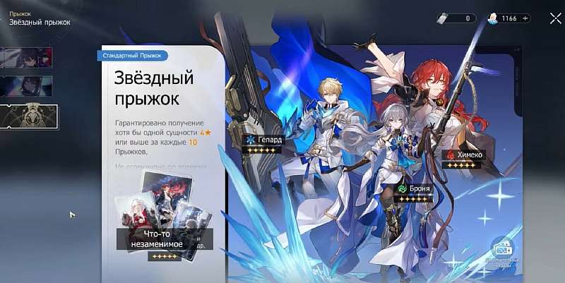 «Звездный прыжок» – постоянный баннер, из которого выпадают персонажи и световые конусы. За каждые 10 круток вы гарантированно получите 4-звездочного персонажа, каждые 90 круток обеспечат одного 5-звездочного. После 300 круток баннера вы сможете бесплатно забрать любого из представленных в баннере персонажей.
