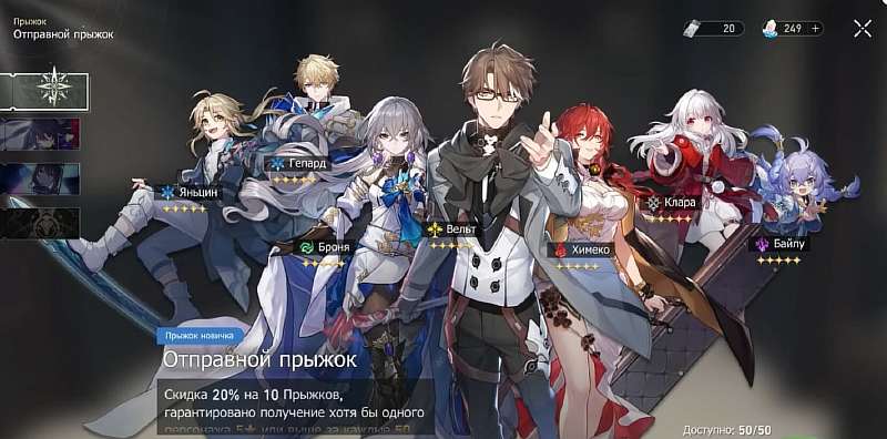 Первый – «Отправной прыжок». Это баннер новичка, прокрутив который 50 раз вы гарантированно получите одного пятизвездочного персонажа. Если он выпадет раньше, то докручивать этот баннер не стоит.