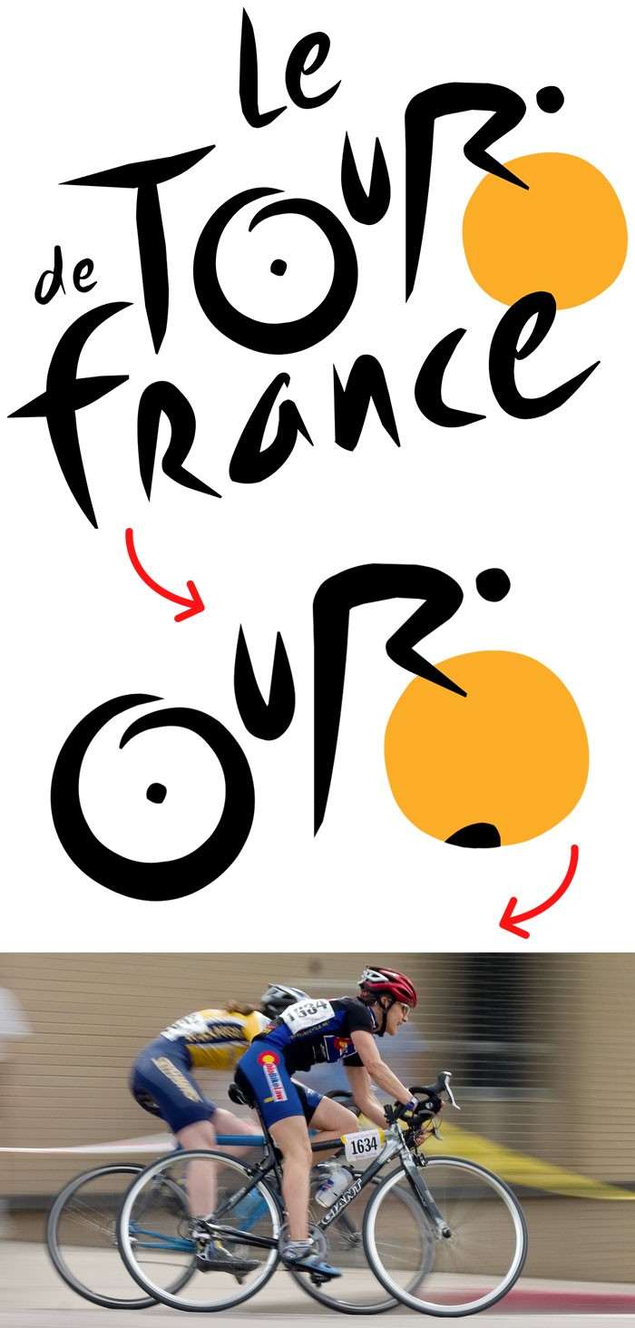 У велосипедной гонки Tour De France очень затейливое лого. Но дело тут не только в тяге французов ко всему претенциозному — посмотрите на очертания букв, они легко складываются в фигуру, мчащуюся вперед на велосипеде.