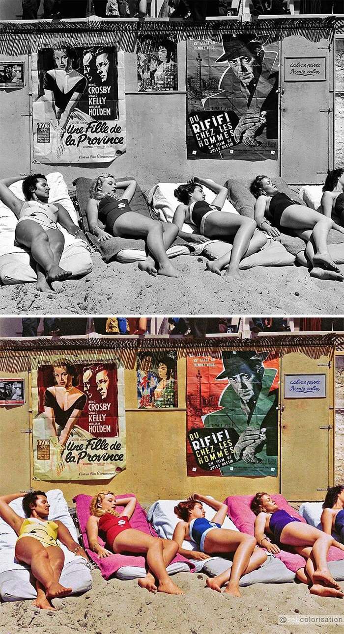 Молодые актрисы принимают солнечную ванну для рекламы фильма во время Каннского кинофестиваля, 1955 год.