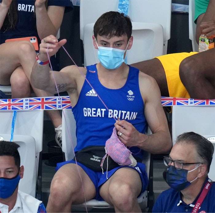 Олимпийский чемпион по плаваиню Том Дейли вяжет на трибунах, чтобы успокоить нервы