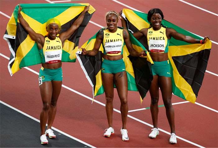Три бегуньи из Ямайки, занявшие весь пьедестал в беге на 100 метров