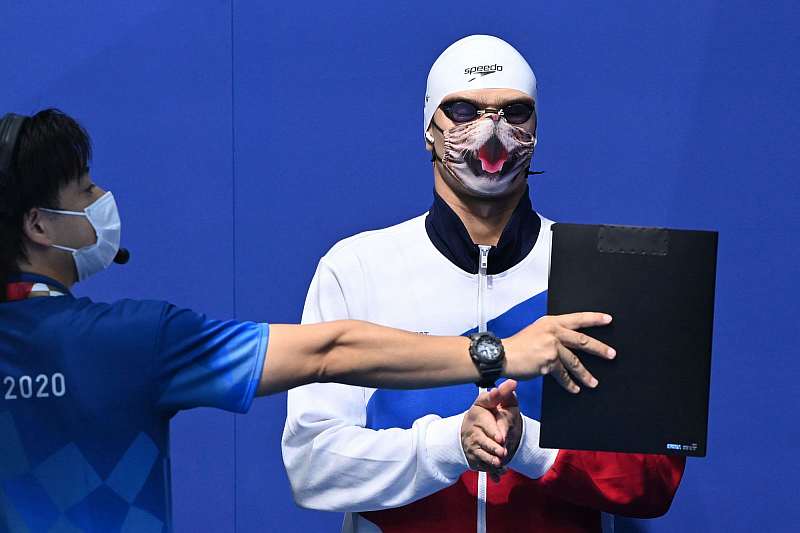 Российский пловец Евгений Рылов в маске с изображением кошки ждет свою золотую медаль