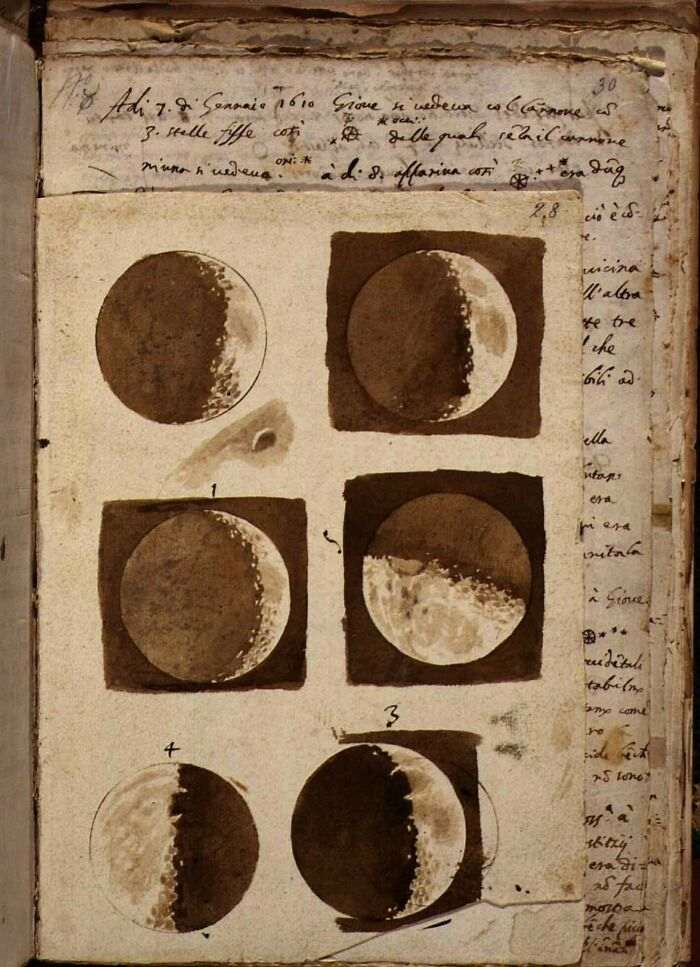 Первые рисунки Луны, сделанные Галилео Галилеем после наблюдения за ней в телескоп в 1609 году