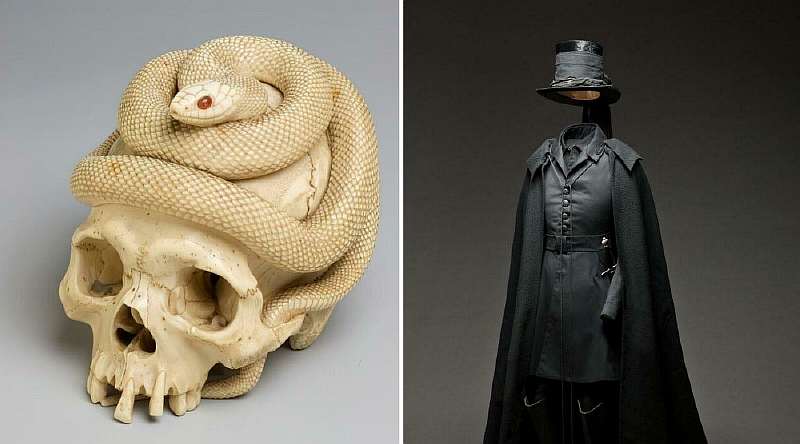 Вырезанный из слоновой кости череп и свернувшаяся в спираль змея с сердоликовыми глазами. Япония, период Эдо, 1860 год
