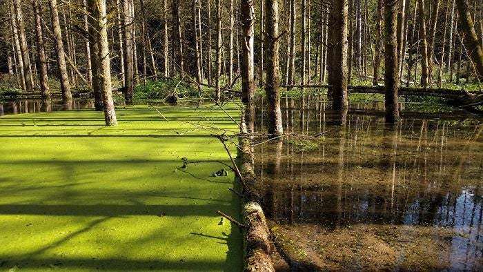 Всего одно упавшее дерево разделяет ряску и чистую воду на болоте