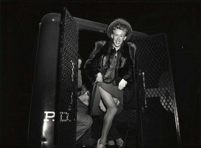 Мужчина, арестованный за разгуливание в женской одежде, выходит из полицейского фургона в Нью-Йорке 1939-го.
