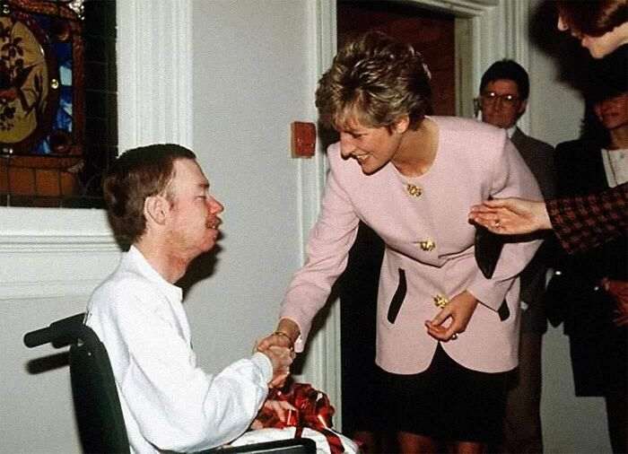 Принцесса Диана без перчаток пожимает руку больному СПИДом в 1991-м, публично демонстрируя, что таких людей не стоит сторониться.