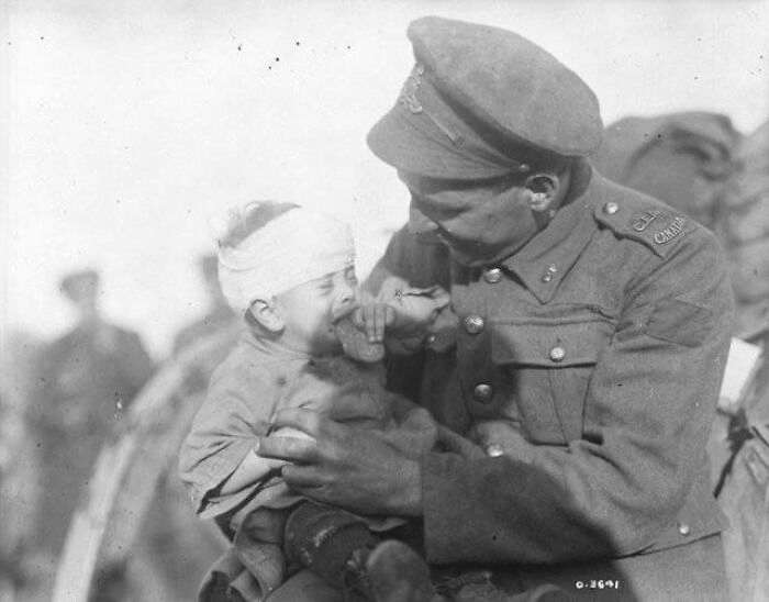 Ноябрь,1918 год. Канадский солдат пытается утешить бельгийского ребенка, чья мать погибла от артиллерийского обстрела.