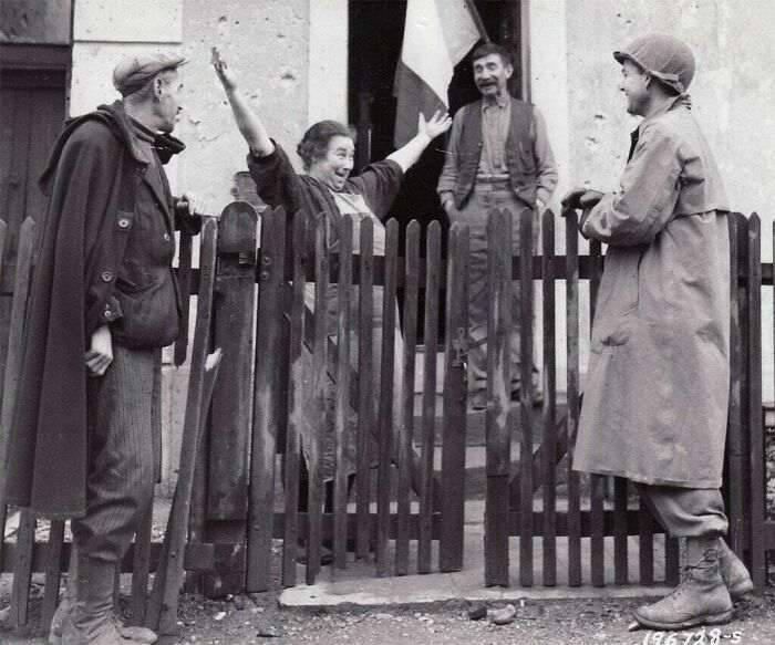 22 ноября, 1944 года. Француженка радостно приветствует американского солдата после освобождения Страсбурга от немцев.